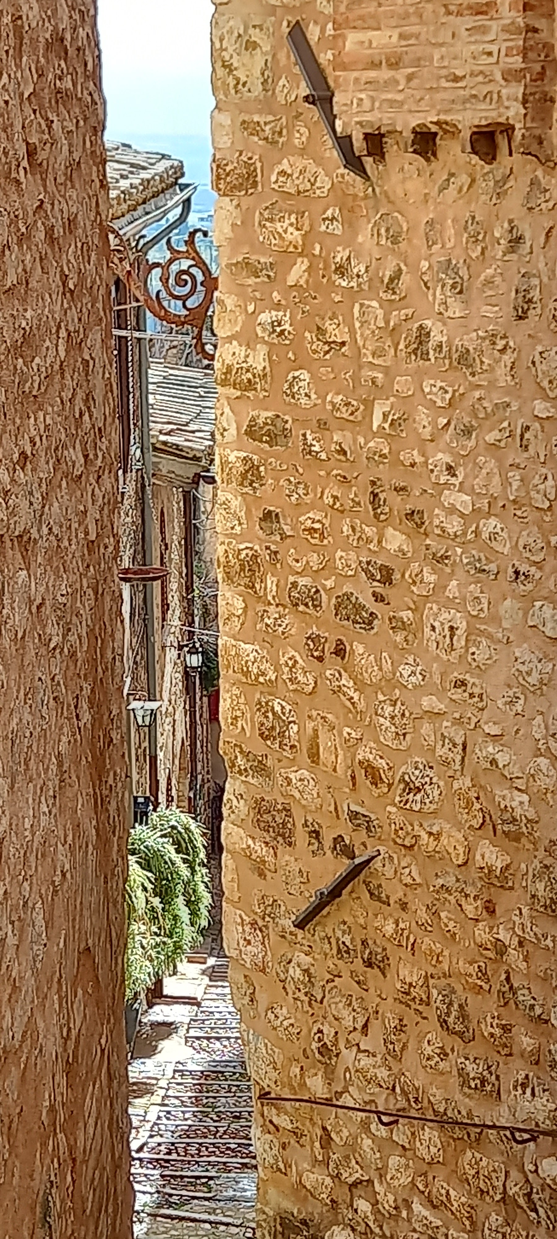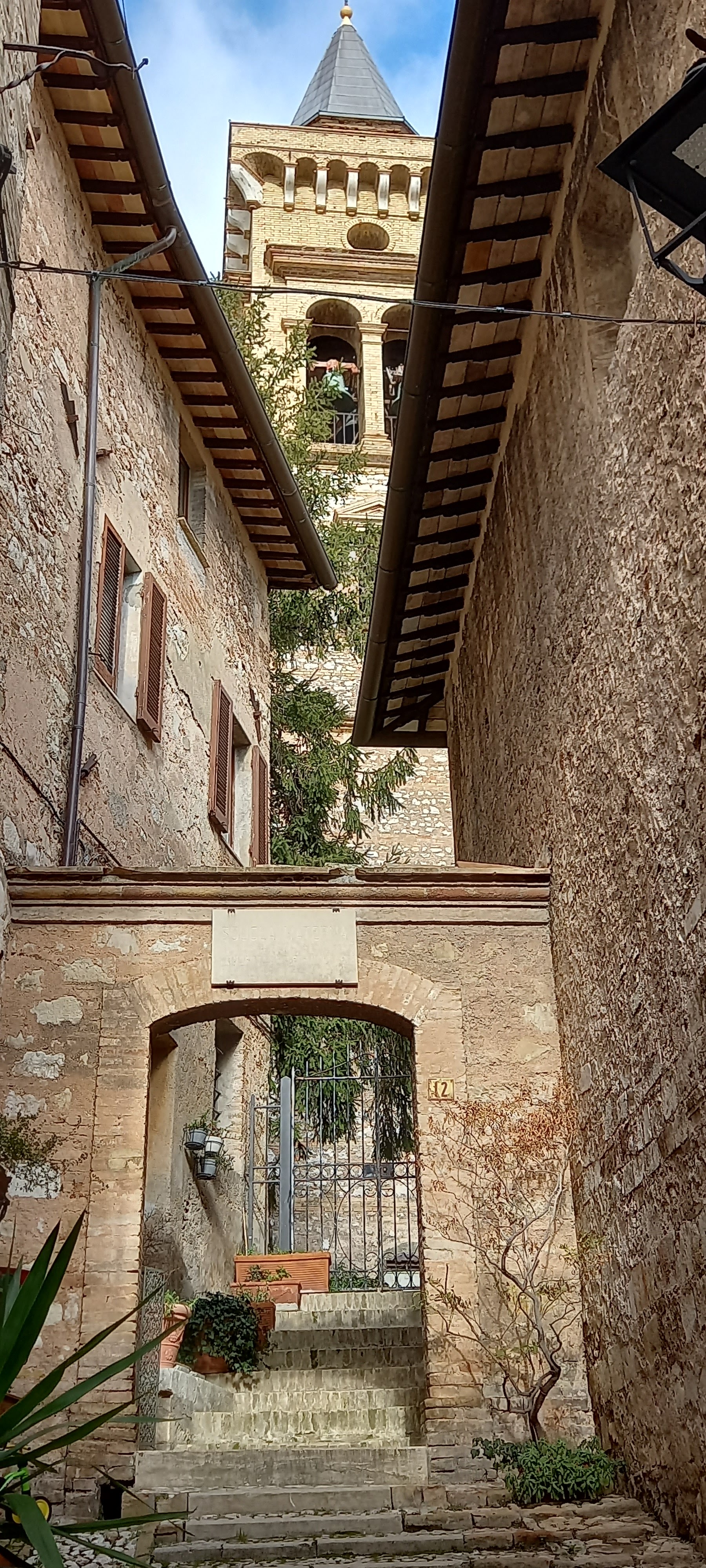 Gira, gira, gira, tutta avvolta su stessa, la fortificata Trevi, come una chiocciola addormentata protegge angusti passaggi, piazze e piazzette, palazzi e chiese antiche. Circondata da ulivi guarda alla Valle umbra dall’alto pendio.