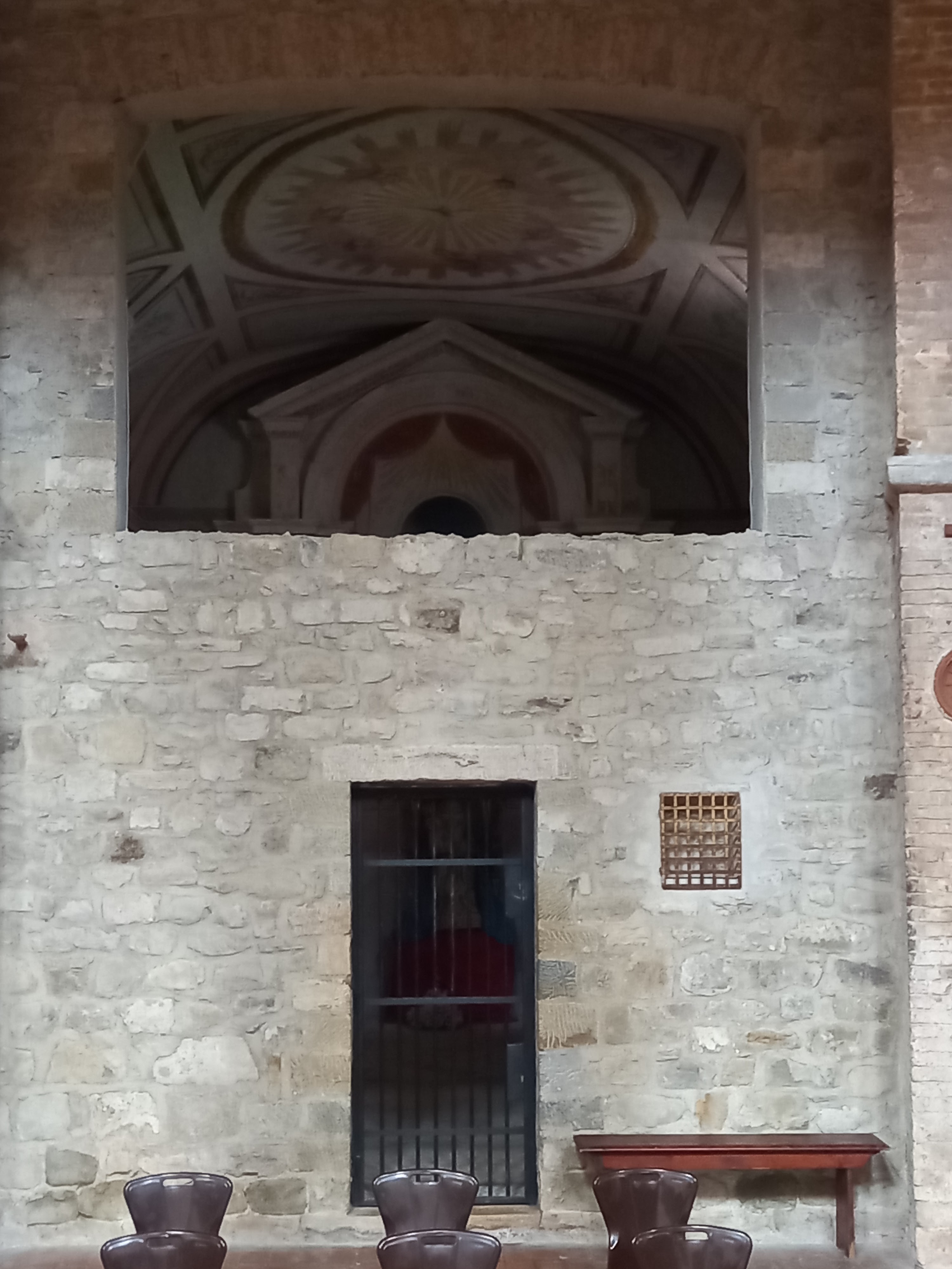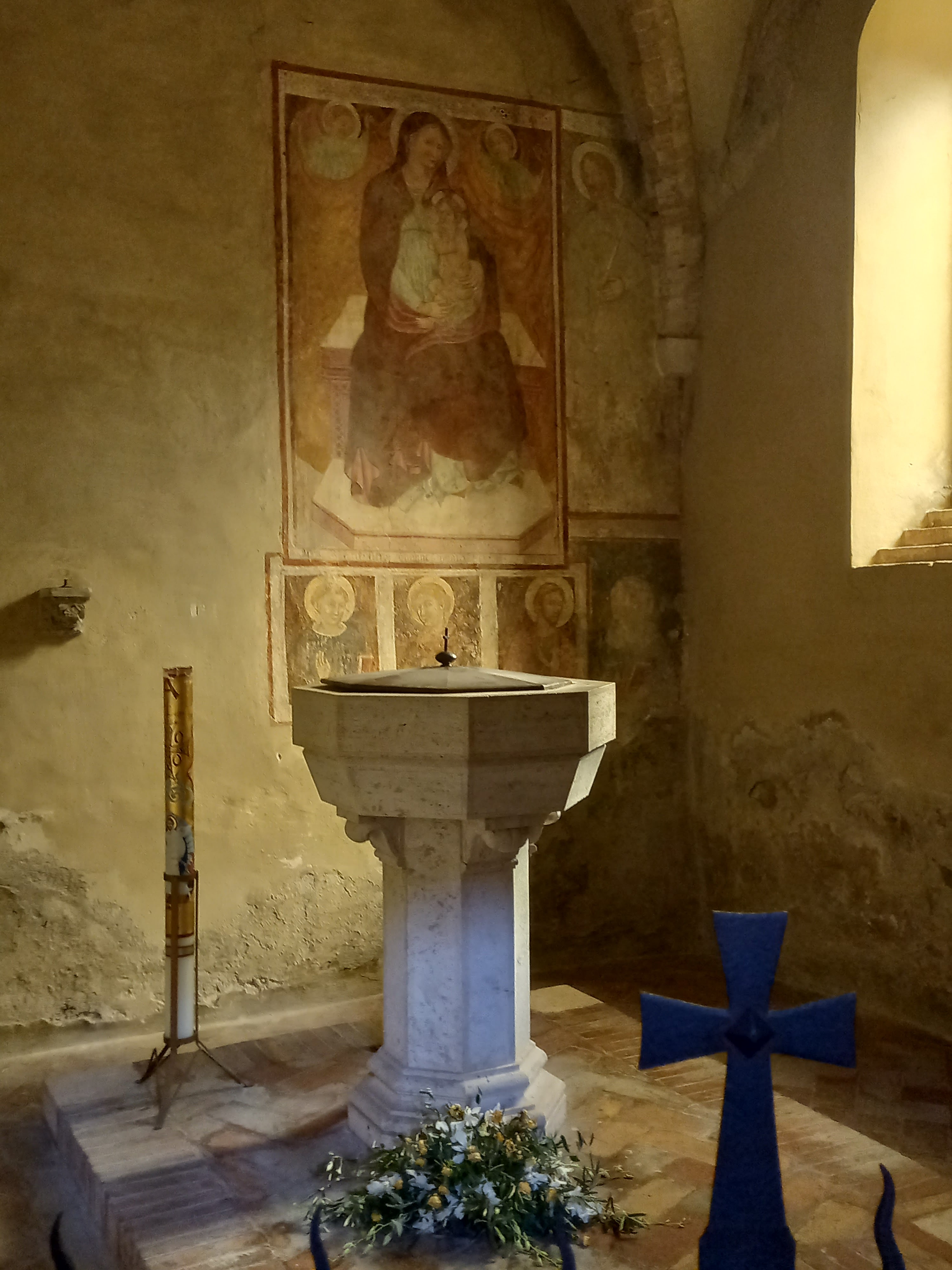 All’interno la luce soffusa che si irradia dalle dodici finestre ci accompagna alla scoperta di tracce e simboli di antiche presenze: le corporazioni delle arti, le sepolture, le colonne, le immagini dipinte. Un luogo incantato fatto di silenzio e parole, di frammenti di passato, di memorie di pietra.